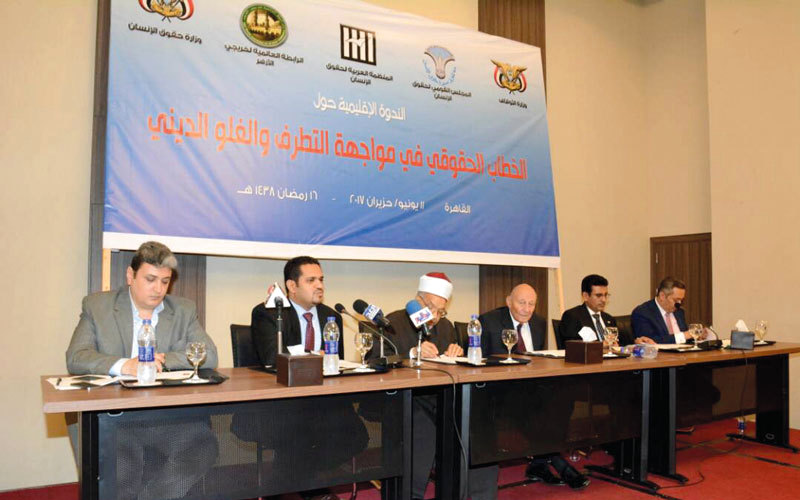 وأضاف أن «مصر تمثل لليمن عمقاً استراتيجياً كبيراً، والعكس أيضاً في جانب الأمن القومي المصري، وإن الحركة الوطنية اليمنية استلهمت ثورة يوليو، وهو ما جعل اليمن أكثر دولة عربية تأثرت بمصر». وأضاف خلال ندوة إقليمية حول الخطاب الحقوقي في مواجهة التطرف والغلو الديني، الذي نظمته المنظمة العربية لحقوق الإنسان، بالتعاون مع المجلس القومي لحقوق الإنسان أن «الوطن العربي يعيش تطرفين، أحدهما سني متمثل في (داعش) و(القاعدة)، والآخر شيعي متمثل في (حزب الله) والحوثيين، اللذين جاءا من الغرف المغلقة، لتحقيق مآربهم السياسية».