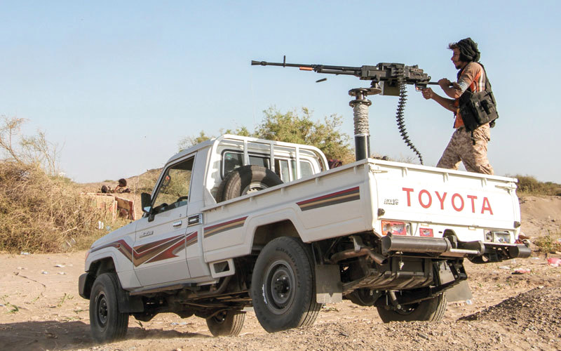 مقاتل من «الشرعية» خلال المواجهات مع الميليشيات في إحدى المناطق شرق المخاء. أ.ف.ب