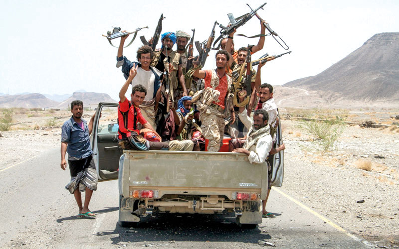 قوة من الشرعية في الطريق إلى معسكر خالد بن الوليد شرق المخاء. أ.ف.ب