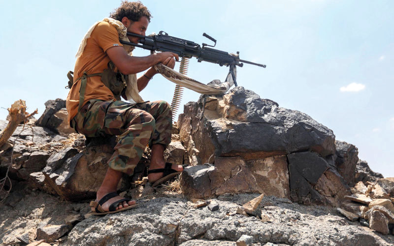 مقاتل من الشرعية خلال المواجهات مع الميليشيات في تعز. أ.ف.ب