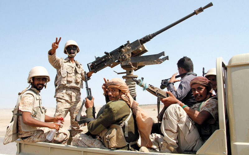 قوات من الشرعية في إحدى مناطق المخاء بعد تطهيرها من المتمردين. أ.ف.ب
