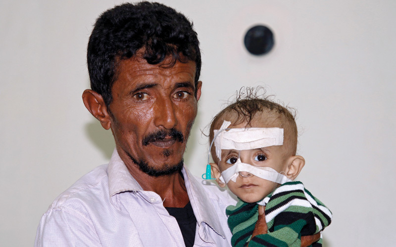 يمني يحمل طفله المصاب بالكوليرا في بلدة الحوتة جنوب لحج. رويترز