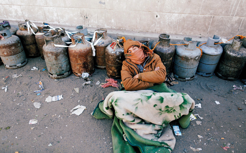 يمني غلبه النعاس خلال انتظاره الذي طال للحصول على أسطوانة غاز في صنعاء. رويترز