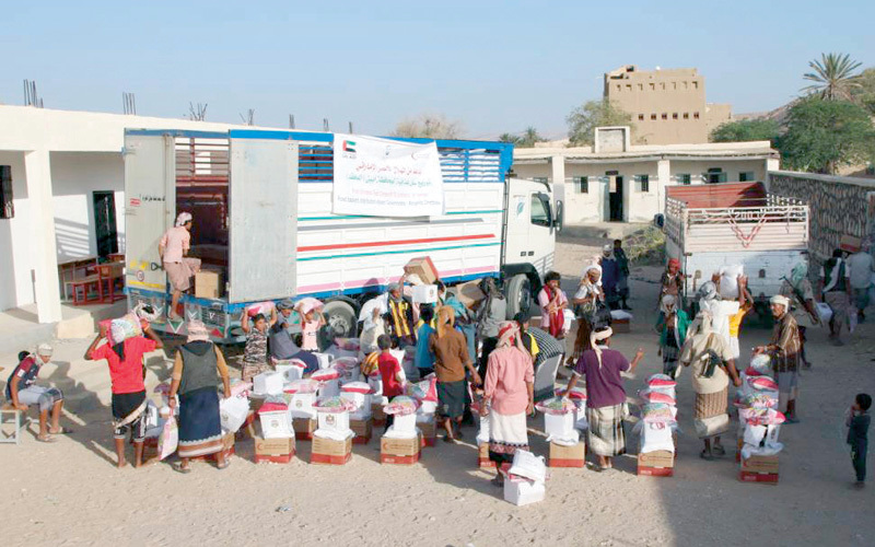 أهالي المحفد خلال تسلمهم المساعدات الإغاثية من «الهلال». وام