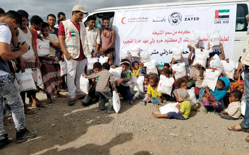 نازحون يتلقون مساعدات «الهلال» في الضالع. وام