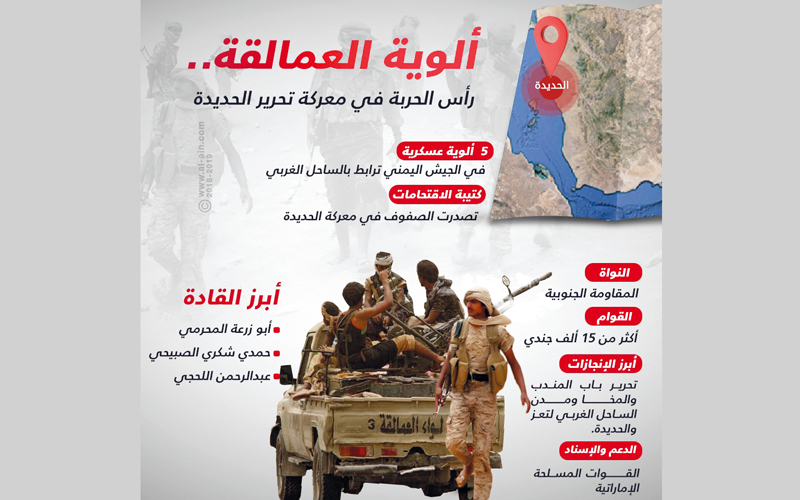 وبدأت ألوية العمالقة في مايو الماضي ضمن القوات اليمنية المشتركة، مرحلة جديدة من العمليات العسكرية، بالزحف لتحرير محافظة الحديدة ومطارها، في الطريق نحو ميناء المدينة الاستراتيجي ثم قلب المدينة.