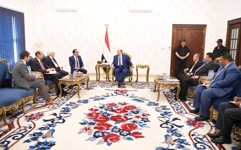 وأكد هادي، خلال لقائه أمس في العاصمة اليمنية المؤقتة عدن مبعوث الأمين العام للأمم المتحدة لليمن، مارتن غريفث والوفد المرافق له، أن معركة تحرير مدينة الحديدة هي جزء من المعركة الوطنية لليمنيين ضد ميليشيات الحوثي الإيرانية في صعدة وصنعاء وتعز وغيرها، حتى تحقيق تطلعات الشعب في السلام، وتطبيق قرارات الشرعية الدولية ذات الصلة، وتسليم السلاح، والجنوح للسلام، باعتبار ألا خيار غيره لمصلحة الشعب اليمني.