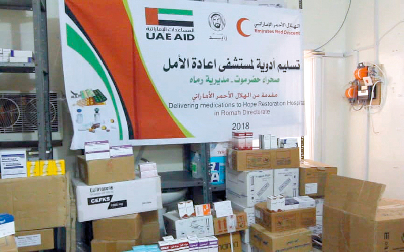 وزعت هيئة الهلال الأحمر الإماراتي، أمس، أدوية متنوعة على مستشفى إعادة الأمل بمديرية رماه بصحراء حضرموت، استمراراً لجهودها للارتقاء بمستوى الخدمات الصحية، وتوفير أهم الاحتياجات النوعية والتجهيزات الضرورية للمستشفيات والمراكز الصحية في اليمن. وأكد ممثل «الهلال الأحمر الإماراتي» في حضرموت محمد عبيد الشامسي، أن هذا الدعم المتواصل من دولة الإمارات يهدف إلى تخفيف العبء عن المواطنين اليمنيين، وتوفير الاحتياجات الطبية والأدوية المجانية لهم. وقال إن هيئة الهلال الأحمر الإماراتي تكثّف من عملها الإنساني بمحافظة حضرموت، عبر تقديم حزمة من المساعدات الإنسانية والغذائية والعلاجية للأهالي، لتلبية احتياجاتهم ومساعدتهم على مواجهة الوضع الإنساني والاقتصادي المتدهور.