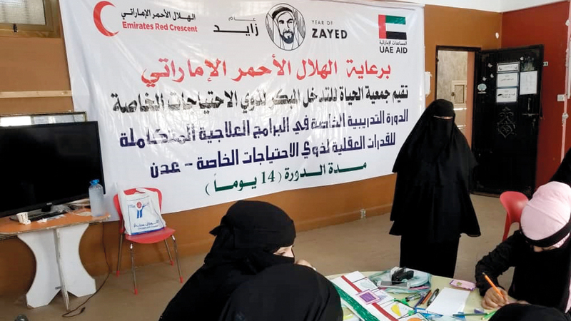 وفي هذا الإطار، حرصت هيئة الهلال الأحمر الإماراتي على دعم جمعية الحياة للتدخل المبكر في عدن، من خلال تنظيم دورة تدريبية في برامج «القدرات العقلية» لـ«أصحاب الهمم»، بهدف رفع القدرة المعرفية لدى المدربين على كيفية التعامل مع الأطفال المصابين بالإعاقات الذهنية، إلى جانب رفع كفاءة السلوك المعرفي لدى الأطفال من «أصحاب الهمم».