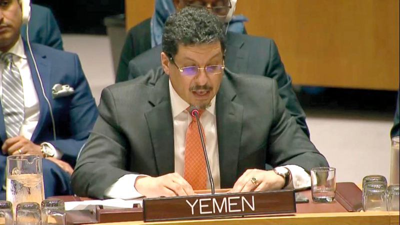 وفي التفاصيل، قال مندوب اليمن الدائم لدى الأمم المتحدة، أحمد عوض بن مبارك، الذي تلا بيان الجمهورية اليمنية أمام مجلس الأمن في الجلسة المفتوحة حول اليمن: «إن السلام لن يتحقق فقط بالتعبير عن دعم جهود المبعوث الأممي الرامية لبدء الحوار، وإنما بالمزيد من الضغط السياسي على ميليشيات الحوثي الانقلابية، وبرسائل واضحة لا تقبل اللبس بأن المجتمع الدولي لن يسمح باستمرار معاناة اليمنيين، واختطاف الدولة، وتهديد الملاحة الدولية، وأنه قد آن الأوان للانصياع لقرارات الشرعية الدولية».