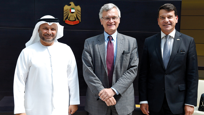 قرقاش خلال استقباله سيمنبي في أبوظبي. وام