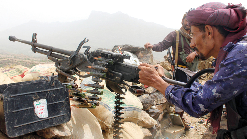 مقاتل من قوات الشرعية يطلق نيران رشاش ثقيل على مواقع للحوثيين على خط الجبهة بين تعز ولحج. أ.ف.ب