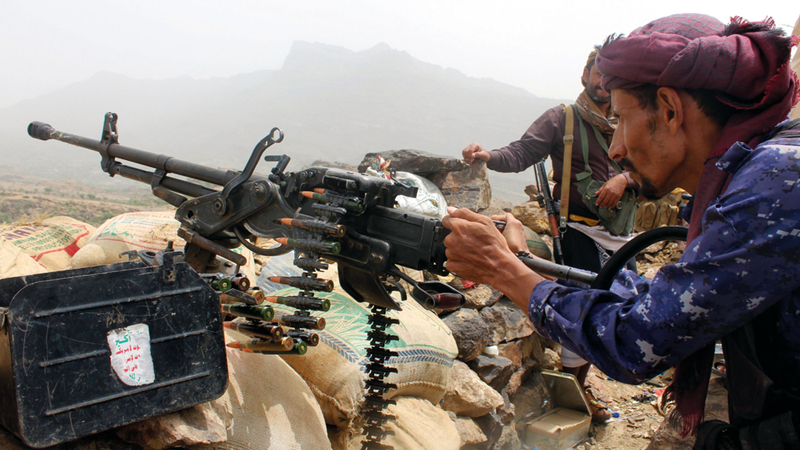 مقاتل يمني يطلق نيران رشاش ثقيل باتجاه مواقع للحوثيين على خط الجبهة بين تعز ولحج. أ.ف.ب