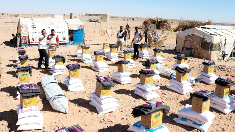 وزّعت هيئة الهلال الأحمر الإماراتي، أول من أمس، مساعدات إغاثية، تضمنت سلالاً غذائية تحوي المكونات الرئيسة للغذاء، إلى جانب مخيمات إيوائية، على أسر البدو الرحل وذوي الدخل المحدود في مديرية عرماء بمحافظة شبوة اليمنية.