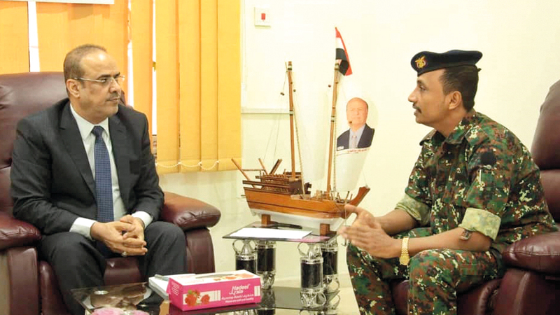 أحمد الميسري خلال لقائه قائد القوات الخاصة بالحديدة العقيد صادق عطية. سبأنت