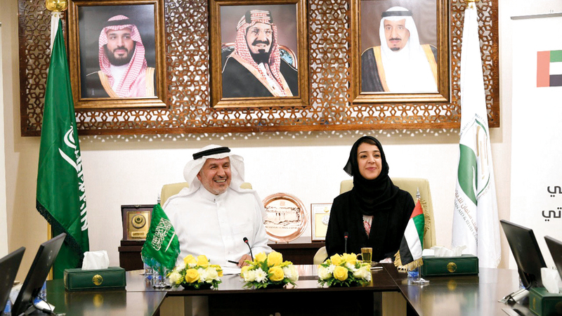 ريم الهاشمي وعبدالله الربيعة خلال إطلاق مبادرة «إمداد» أمس. وام