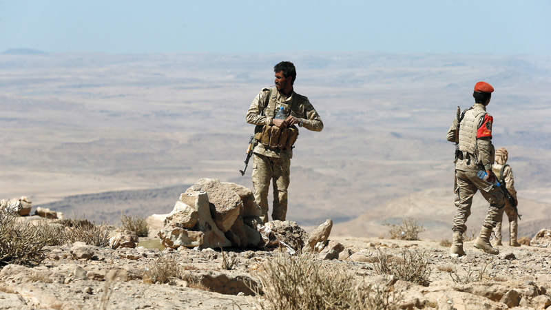 جنود من الجيش اليمني في أحد المواقع على جبهة نهم القريبة من صنعاء. رويترز