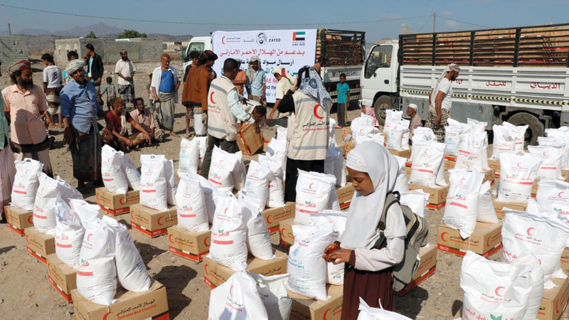 جانب من مساعدات «الهلال» أهالي المسيمير. وام