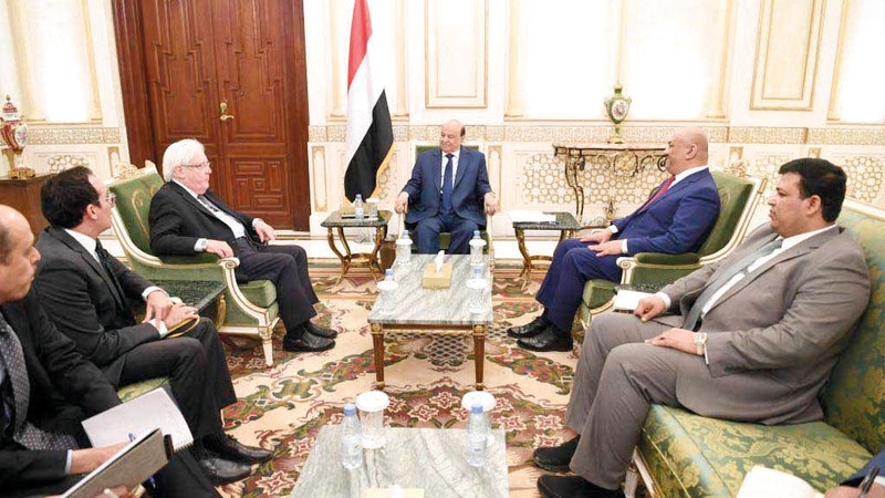 ولفت هادي إلى جملة التنازلات التي قدمتها الحكومة الشرعية في سبيل تحقيق السلام، وقال لـ«غريفيث»: «للأسف لم تقابل جماعة الحوثي الانقلابية ذلك إلا بصلف وتعنت وتمرد على كل الاتفاقات والتفاهمات، كما هو عهدها، وآخرها ما يتصل بميناء ومدينة الحديدة ومسرحية الانقلابيين في هذا الإطار، وعدم التزامهم بما تم الاتفاق عليه في ما يتعلق بالأسرى والمعتقلين والمحتجزين، وإعاقة مرور الإغاثة الإنسانية».