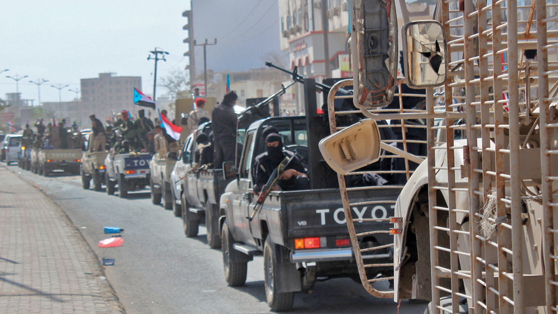 مسيرة عسكرية خلال موكب جنازة رئيس الاستخبارات العسكرية اللواء محمد صالح طماح الذي قضى متأثراً بجراحه في تفجير العند. أ.ف.ب