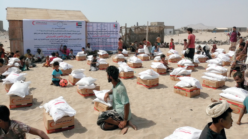 جانب من المساعدات التي وزعتها «الهلال» في لحج. وام