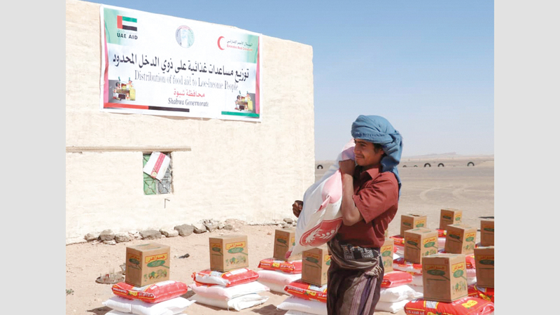 جانب من المساعدات التي وزعتها «الهلال» في شبوة. وام