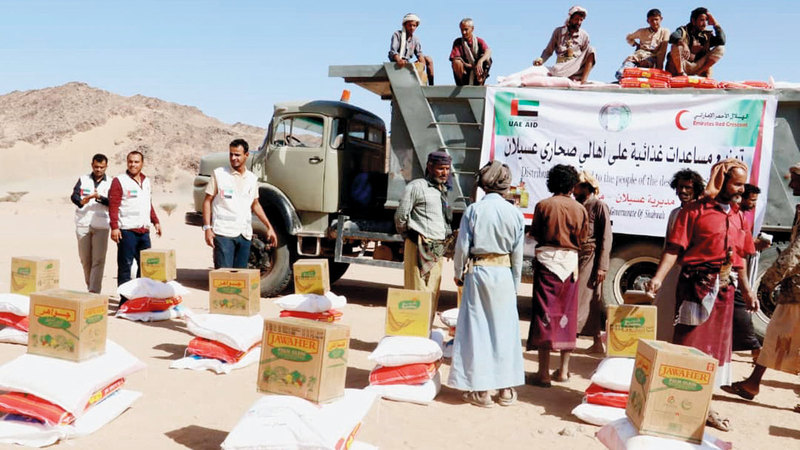 جانب من مساعدات «الهلال» بالمناطق الصحراوية في شبوة. وام