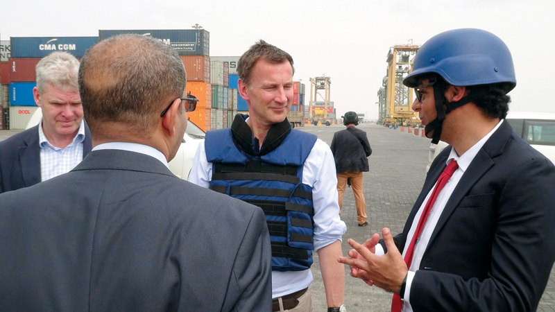 هانت خلال زيارة لميناء عدن أول من أمس. رويترز