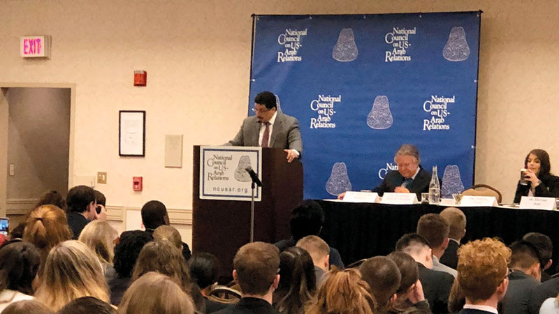 جاء ذلك خلال كلمته في اللقاء السنوي للجامعات الأميركية «نموذج الجامعة العربية» الذي ينظمه المجلس القومي للعلاقات الأميركية العربية بحضور ممثلين من السلك الدبلوماسي والأكاديميين وعدد كبير من طلاب العلوم السياسية والمهتمين بالشرق الأوسط يمثلون ٢٥ جامعة أميركية.