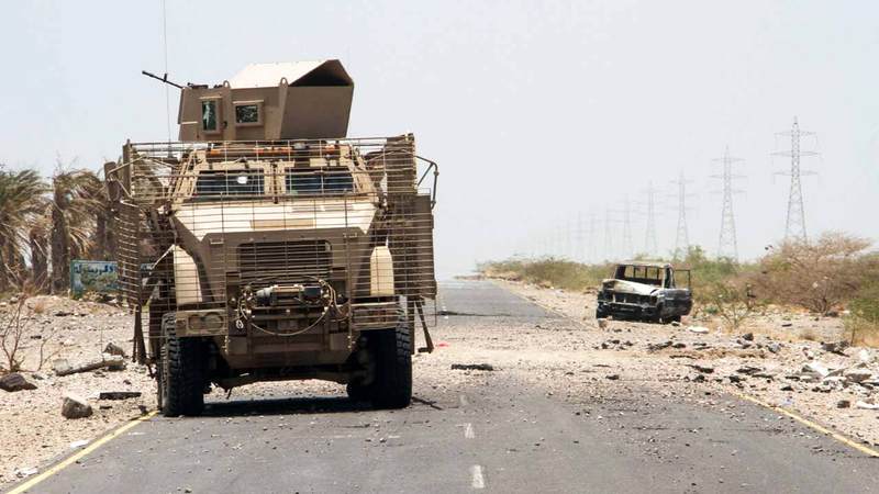 مدرعة لقوات الشرعية في الطريق المؤدي إلى معسكر خالد بالمخاء. أ.ف.ب