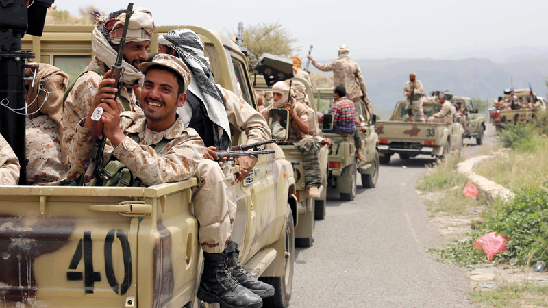 قوات من الشرعية اليمنية في إحدى الطرق بمنطقة يافع شمال عدن. أ.ف.ب