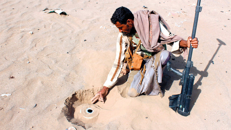الكشف عن أحد الألغام الحوثية التي تستهدف المدنيين. أرشيفية