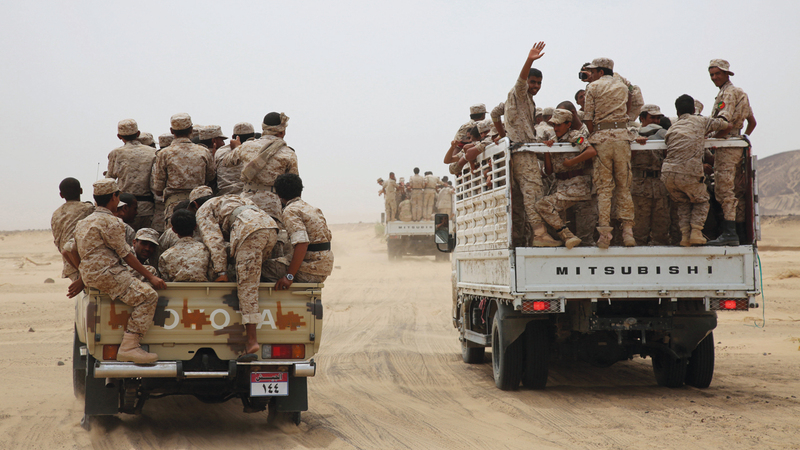 جنود يمنيون على متن سيارات في إحدى المناطق وسط مأرب. رويترز
