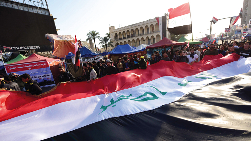 متظاهرون يحملون العلم في ساحة التحرير وسط بغداد. إي.بي.إيه