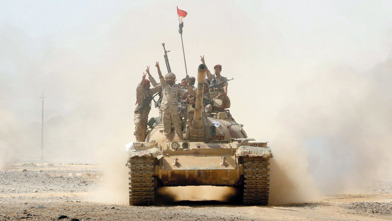 مقاتلون من الجيش اليمني يرفعون شارة النصر عقب إحراز تقدم على الميليشيات. أرشيفية