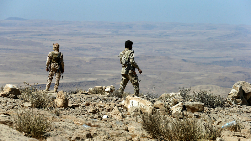 مقاتلان من الجيش اليمني أعلى مرتفعات قريبة من صنعاء سيطر الجيش عليها. ■ أرشيفية