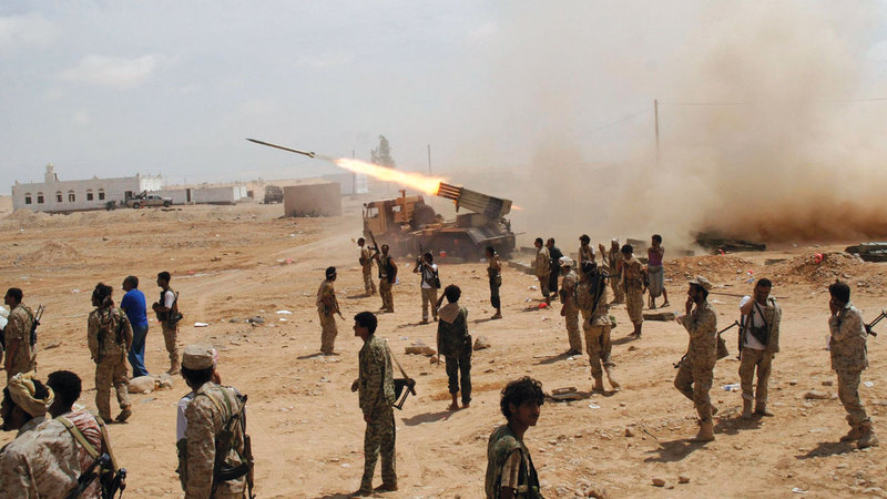 مقاتلون من الجيش اليمني خلال قصف مواقع للميليشيات. أرشيفية