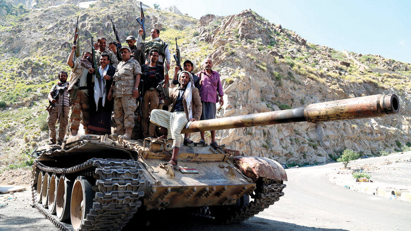 مقاتلون من قوات الشرعية اليمنية يقفون أعلى دبابة بالقرب من مدينة تعز. أرشيفية