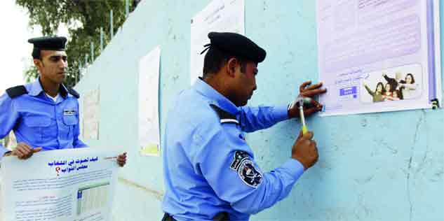 شرطيان عراقيان يعلقان ملصقات إرشادية عن الانتخابات في البصرة. أ.ب