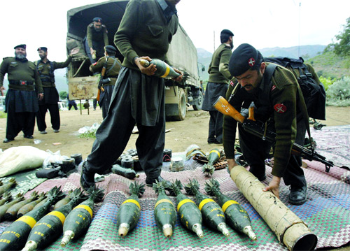 قوات باكستانية تعرض أسلحة غنمتها من المسلّحين في بيشاور. رويترز