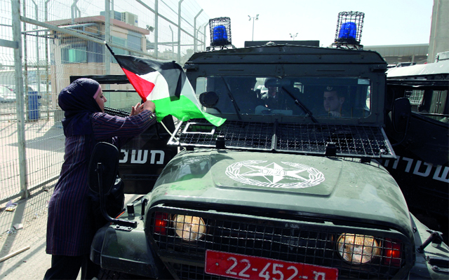 فلسطينية تضع العلم الفلسطيني على سيارة لجيش الاحتلال خلال مواجهات قرب حاجز قلنديا. أ.ف.ب