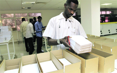 موظفون سودانيون يعدون الأوراق الانتخابية. رويترز
