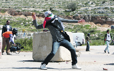 شاب فلسطيني يرمي قوات الاحتلال بحجر خلال احتجاج في الضفة. رويترز