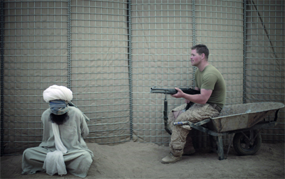 جندي من المارينز يوجّه بندقيته إلى أحد المعتقلين في مرجة. أ.ف.ب