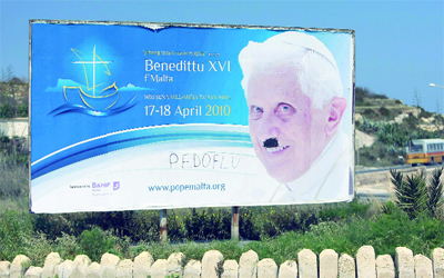 ورسمت على إحدى اللوحات الموجودة في طريق مزدحم في مالطا شارباً يماثل شارب هتلر على وجه بابا الفاتيكان، ووضعت عليها علامات تشير إلى الانتهاكات الجنسية ضد الأطفال. يشار إلى أن البابا الذي يزور الجزيرة يومي 17 و18 من الشهر الجاري، ألماني الجنسية، وكان مجنداً في القوات الألمانية في المراحلة النهائية من الحرب.