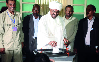 أدلى الرئيس السوداني عمر البشير بصوته ظهر أمس في مدرسة في وسط الخرطوم. وحيا الرئيس السوداني الذي كان يرتدي الجلابية التقليدية وعمامة بيضاء الحشد بقوله «الله اكبر» رافعاً يده ليظهر اصبعه الملطخ بالحبر لدى خروجه من مركز اقتراع مدرسة سان فرنسيس القريب من مسكنه ومن مقر رئاسة الجيش والامن. وسار حشد من انصار البشير خلفه.