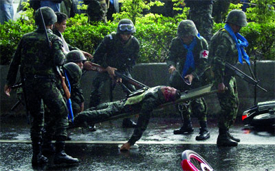 ويأتي حادث أمس في سلسلة حوادث سفك الدماء في العاصمة التايلاندية، حيث قتل 27 شخصاً واصيب نحو 1000 هذا الشهر، في أسوأ أعمال عنف سياسية تشهدها البلاد منذ نحو عقدين. ولم يتضح ما اذا كان الجنود يستخدمون الذخيرة الحية، الا ان الجيش حذر المتظاهرين من انهم يمكن ان يتعرضوا لإطلاق النار في اي اشتباك. وقال مسؤولون في وقت سابق إن رجال الشرطة والجيش اطلقوا عيارات تحذيرية باتجاه المتظاهرين.
