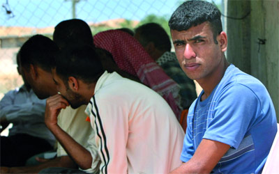 الفتى فادي عيادة العزازمة (يمين) في خيمة الاعتصام بعد إبعاده إلى غزة. أ.ف.ب
