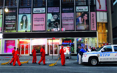 عمال نظافة يمارسون عملهم بميدان «تايمز سكوير» الذي شهد محاولة التفجير. غيتي