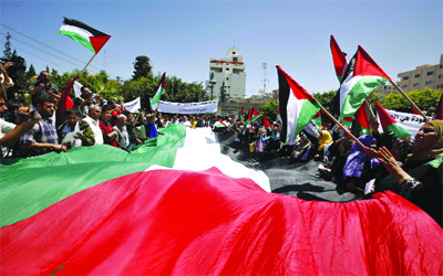 الرايات الحزبية تتوارى أمام علم فلسطين في ذكرى النكبة في غزة. رويترز